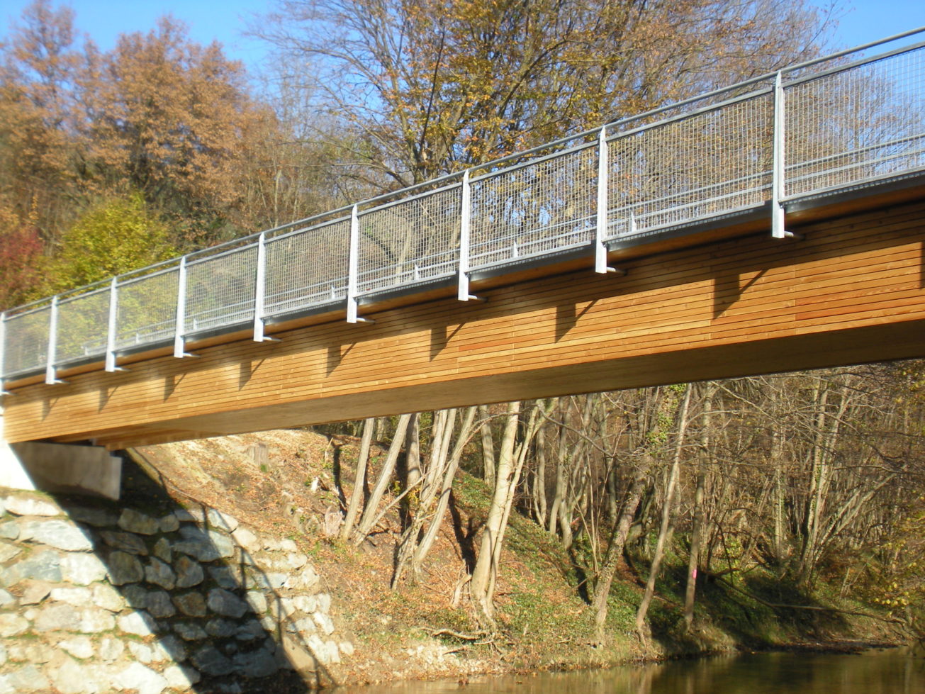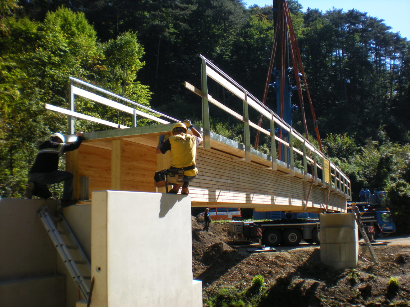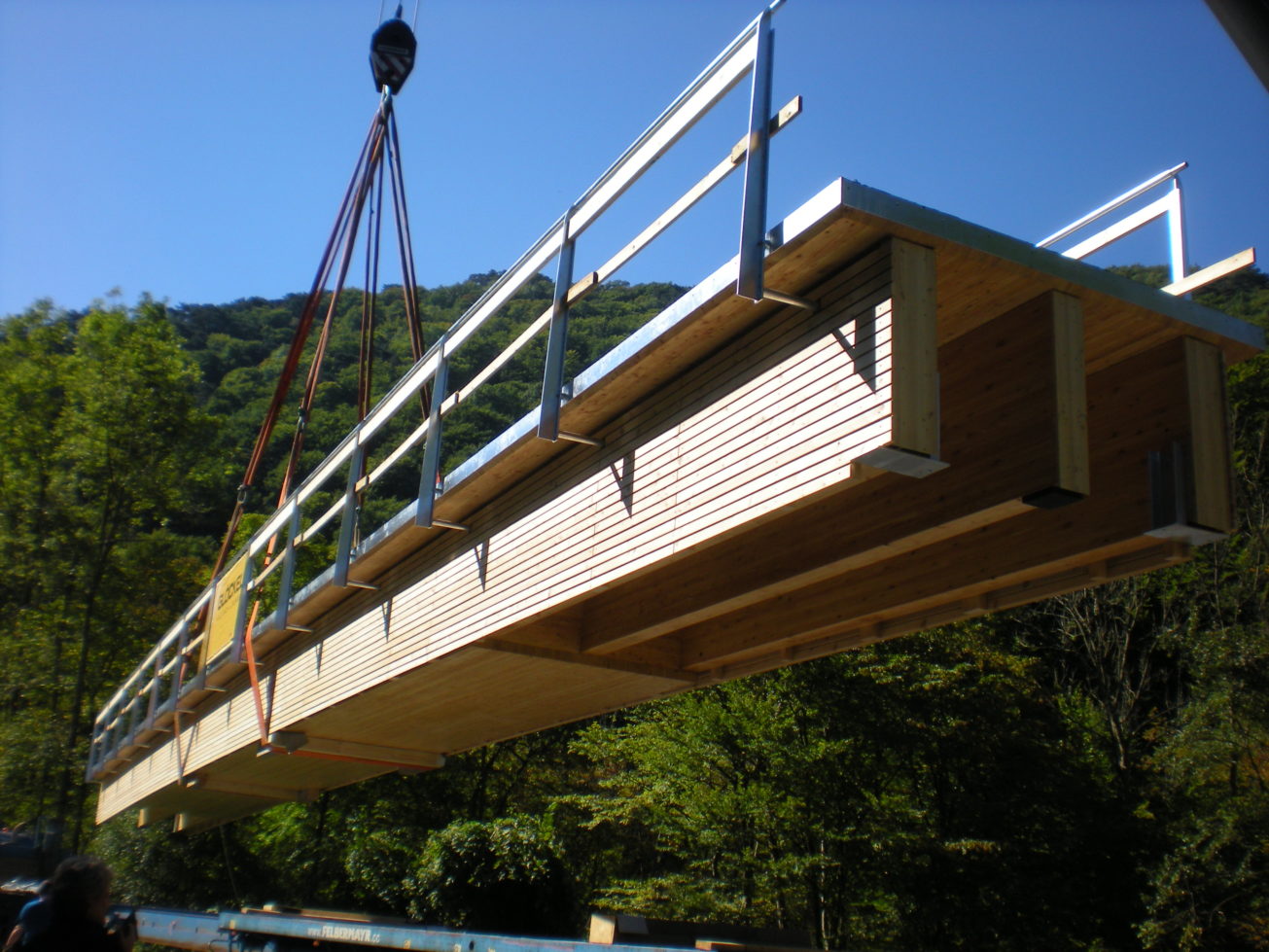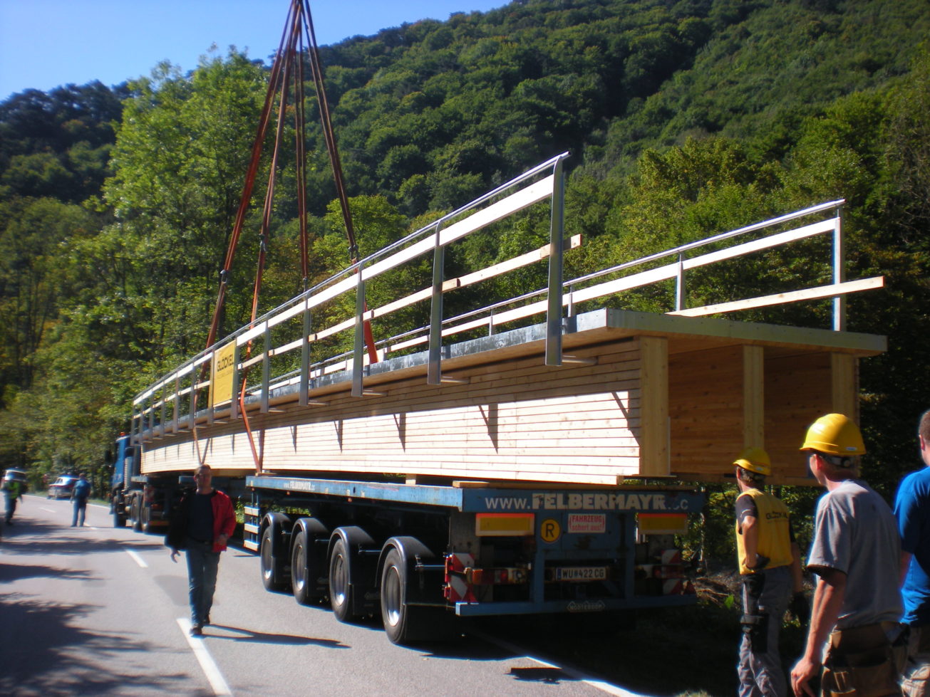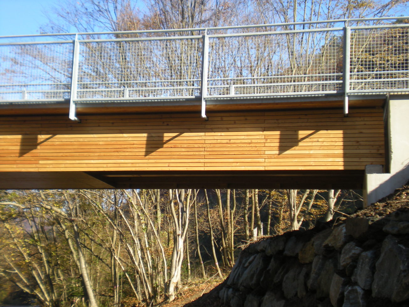 konstruktion: deckbrücke mit bituminöser abdichtung und asphaltbelag. hohlkasten bzw. plattenbalken aus brettsperrholz mit brettschichtholz